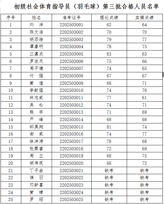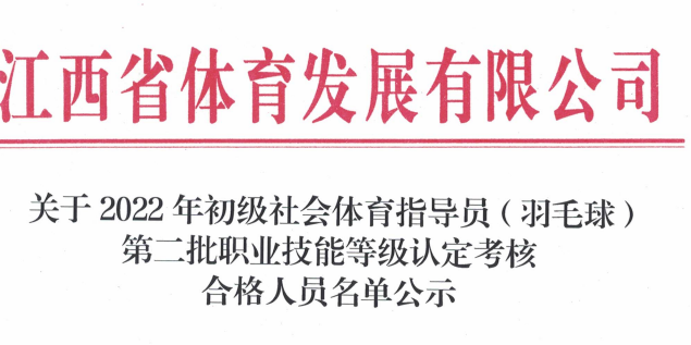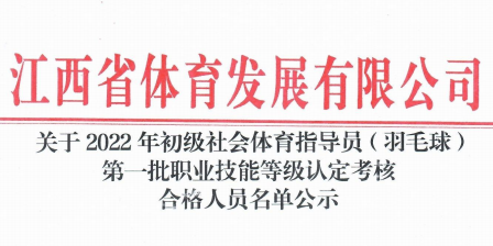關于2022年初級社會體育指導員(羽毛球)第三批職業(yè)技能等級認定考核合格人員名單公示 根據《江西省人力資源和社會保障廳關于公布江西省第...