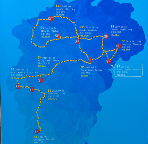 本屆環(huán)鄱賽將于9月17日至28日在全省11個(gè)設(shè)區(qū)市舉行,賽事總獎(jiǎng)金25萬(wàn)美元。參賽隊(duì)伍22支,參賽選手及領(lǐng)隊(duì)、教練員220人左右,全部由職業(yè)隊(duì)、國(guó)家隊(duì)及省隊(duì)組成。十一個(gè)分賽站為:贛州市上猶縣(17日)、吉安市吉安縣(18日)、萍鄉(xiāng)市武功山(19日)、新余市仙女湖(20日)、撫州市夢(mèng)湖(21日)、上饒市橫峰縣(22日比賽、23日休息)、鷹潭市龍虎山(24日)、景德鎮(zhèn)市浮梁縣(25日)、宜春市靖安縣(26日)、九江市武寧縣(27日)、南昌市高新區(qū)(28日),大賽總賽程1056公里,轉(zhuǎn)場(chǎng)里程1788公里。11個(gè)賽站共設(shè)置25個(gè)途中沖刺點(diǎn)、10個(gè)爬坡點(diǎn)。